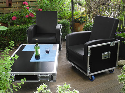 Komplette Sitzgruppe in einer Box: Zwei bequeme Sessel und ein praktischer Tisch – transportabel, platzsparend und werkzeugfrei.